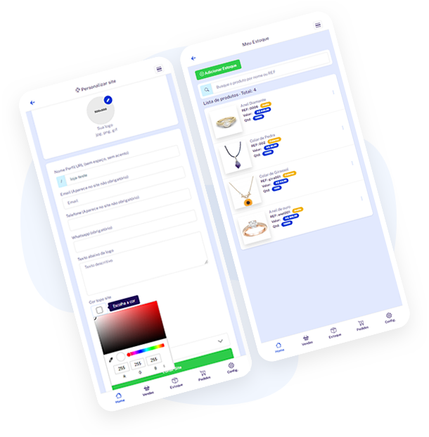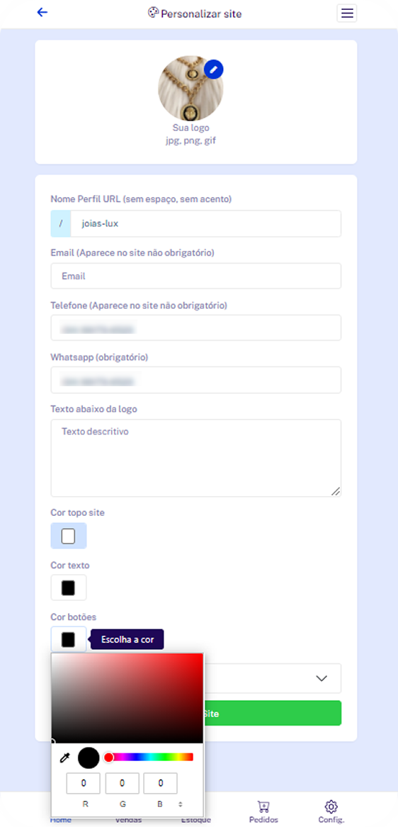 Personalize seu site com suas informações, cores e logo.